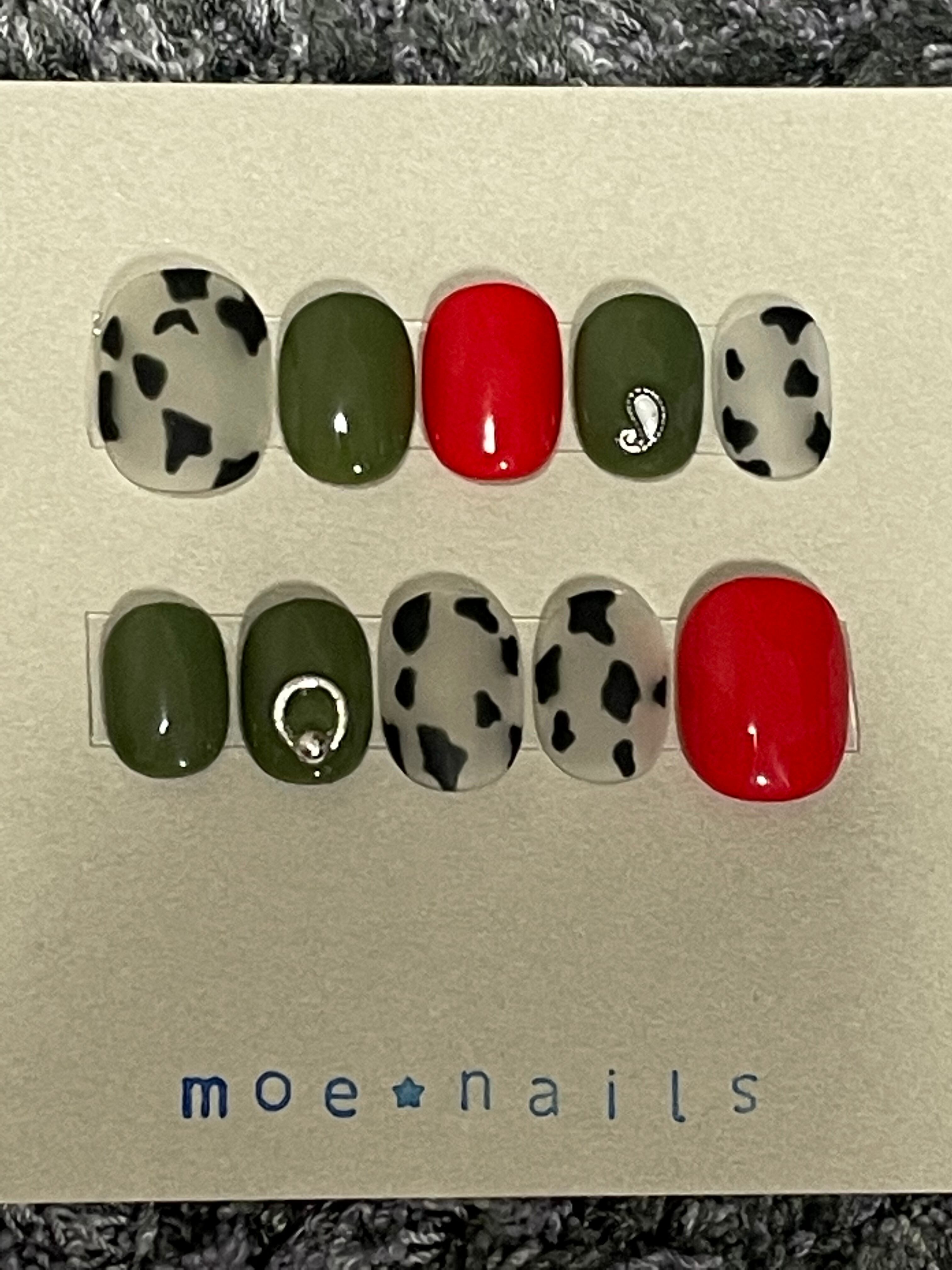 ネイルチップ・透け感マット牛柄(レッド×カーキ)